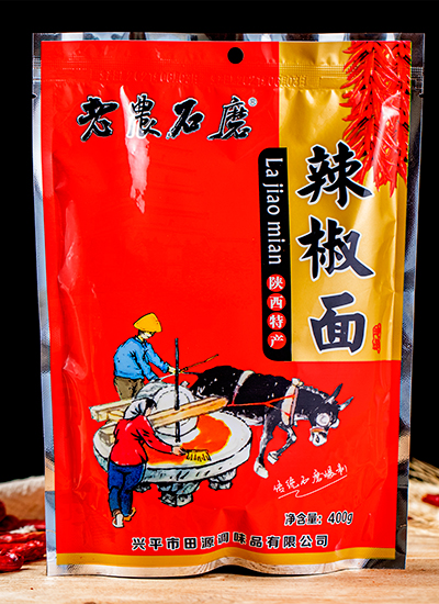 老農石磨系列產品選用興平原產線椒,具有皮薄、肉厚、粒小、色澤鮮亮、香辣春香、辣不過喉的特點;人工精挑細選、去蒂除雜,使用旋轉式鍋爐恒溫炒制確保辣椒色澤鮮艷味道醇香;沿用原始青石碾磨工藝,利用青石清涼特性收到了良好的碾磨散熱效果,保留辣椒原有的自然香味。經篩選、炒制、碾磨等多到古法工藝使產出的辣面色澤紅亮,辣味濃郁,營養豐富,味道醇香。